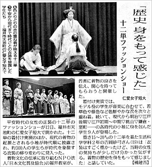 生活科学学科の1,2年生300人が見守る中、10人の学生さん達がモデルとして登場、音楽に合わせて時代ごとの衣装を披露して頂きました。『毎日新聞』福井版に記事が掲載されました。