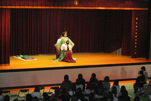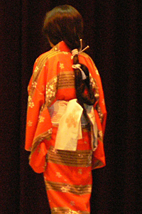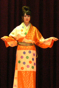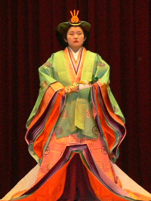 現代のきものの源流は「小袖」と呼ばれるものです。小袖は平安時代の十二単の下着、及び庶民の衣服でした。その小袖が発展して現代の着物となる過程を時代ごとにファッションショーでお見せし、同時に今に伝わる十二単のお服上げ(着装)披露致しました。