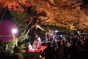 奈良の地には名社、古社がたくさんあります。 その中の一つ桜井市にある「等彌神社」では年間を通していろいろなイベントが催されております。 中でも11月の「献灯祭」は錦織りなす紅葉に1週間ライトアップされ同時に足元には四百個のぼんぼりに献灯がなされ圧巻です。 この度その中で行われる「新嘗祭」に参加させて頂きました。