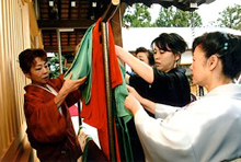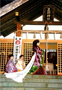 福井で初めての「華まつり(宮廷装束 十二単お服上げ)」の成功をご協力頂いた皆様、駆けつけて頂いた生徒の皆様、テレビや新聞で知り、来て頂いたお客樣方にお礼申し上げ心より感謝致します。 会場となった足羽神社は第26代継体天皇を祭祀る神社であって継体天皇末裔の馬来田宮司にも大変お世話になりました。 講師一同緊張の連続でしたが、モデルをされた人達も「やって良かった」と言って頂き「裳抜け」の時には客席から歓声も上がり「楽しかった、きれいだった」という声を聞くことができ、とても感動しました。 又、韓国の水原市議会議長訪問団の皆様にも見て頂いて国際社会に少しでも貢献できたことを嬉しく思います。 これから毎年2回3回と華まつりが続きますが講師一同一丸となって頑張ってゆきたいと思います。