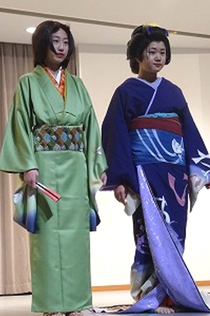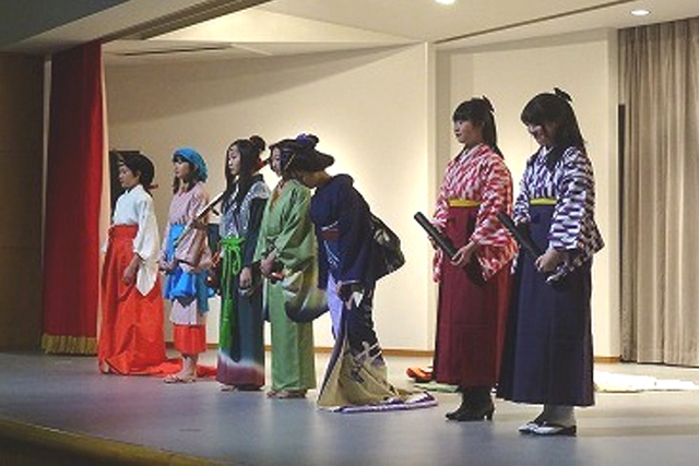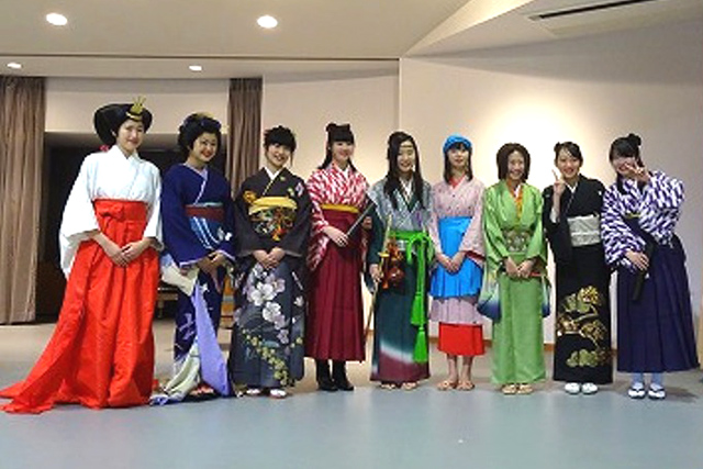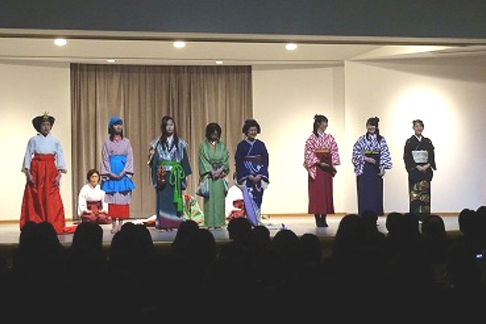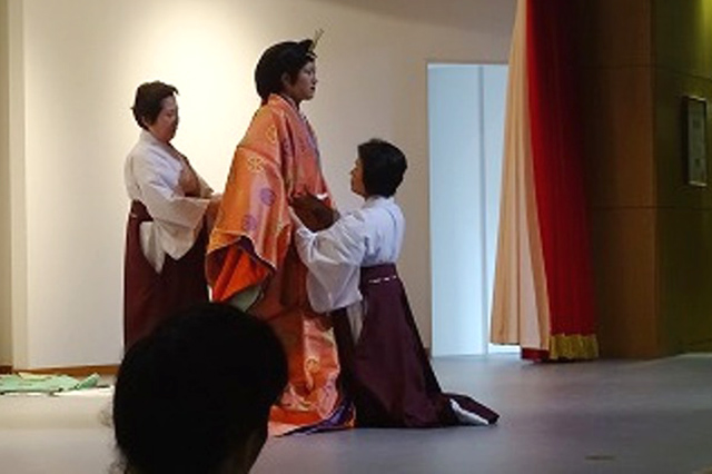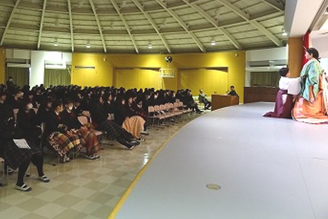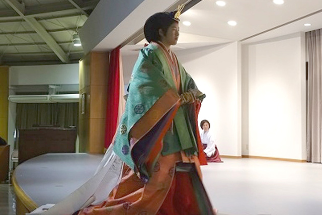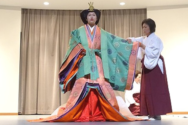 大阪梅花高校内にて学生さんを対象に『十二単の着装及び小袖の変遷』の講演と着物ショーを執り行いました。 現代のきものの源流は「小袖」と呼ばれるものです。小袖は平安時代の十二単の下着、及び庶民の衣服でした。その小袖が発展して現代の着物となる過程を時代ごとにファッションショーでお見せし、同時に今に伝わる十二単のお服上げを(着装)披露致しました。