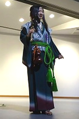 “今回、モデルを経験させていただいてすごく楽しかったです。出雲阿国さんの衣装なんて、たぶんこの先着る機会はないと思います。 はじめは、出雲阿国さんの役は嫌でしたが、やってみるとこの役に選ばれてよかったなと思いました。 また、間近でたくさんのいろんな時代、身分の衣装を見られて、帯の巻き方の美しさ、綺麗な着物の柄、髪の結い方などを身近に感じられたことが、すごく貴重な経験となりました。 このような機会をいただき、ありがとうございました。”