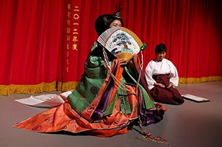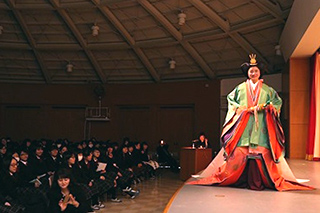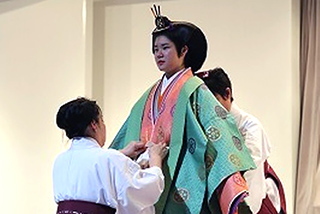 大阪梅花高校内にて学生さんを対象に『十二単の着装及び小袖の変遷』の講演と着物ショーを執り行いました。 現代のきものの源流は「小袖」と呼ばれるものです。小袖は平安時代の十二単の下着、及び庶民の衣服でした。その小袖が発展して現代の着物となる過程を時代ごとにファッションショーでお見せし、同時に今に伝わる十二単のお服上げを(着装)披露致しました。