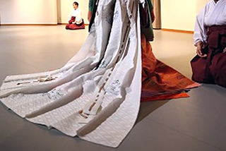 〈留袖〉 ミセスの正式礼装のきものです。留袖の語源は江戸時代、結婚後、又は男女共元服すると振袖の振りを切って身頃に振りを縫い留めた、いわゆる「袖留」のきものを着用したところから起こった名称といわれています。 黒留袖と色留袖がありますが、黒は婚家に一生とどまる意志を込めているといわれており、特に結婚式の仲人・新朗・新婦の母親は通常黒留袖を着用します。 又、別名江戸褄ともいわれています。これらは模様付けからつけられた名称です。帯は袋帯。結び方は二重太鼓。二重太鼓はお太鼓結びの変形で、太鼓の部分が二重になっているのでこの名がつきました。
