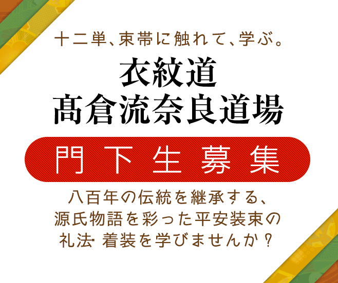 八百年の伝統を継承し、源氏物語などの平安文化を彩った装束(十二単・束帯)の礼法を学び、その着装の技術『衣紋道』に触れてみませんか?