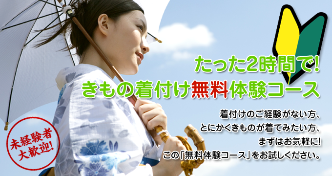 たった2時間で、きものに実際に触れ、着付けの雰囲気を体験できる無料体験コース。この機会にぜひご参加ください。