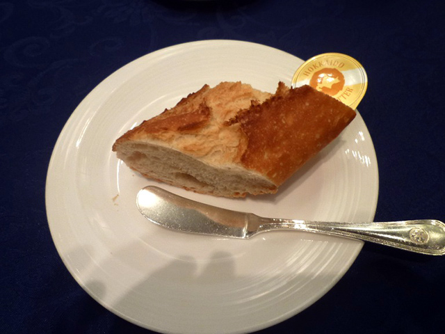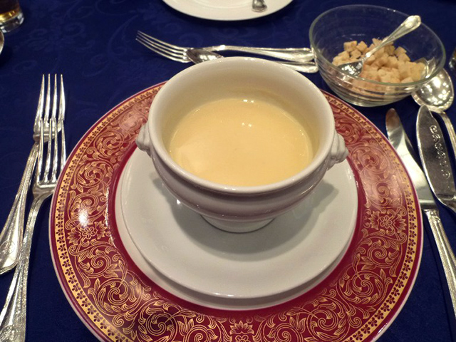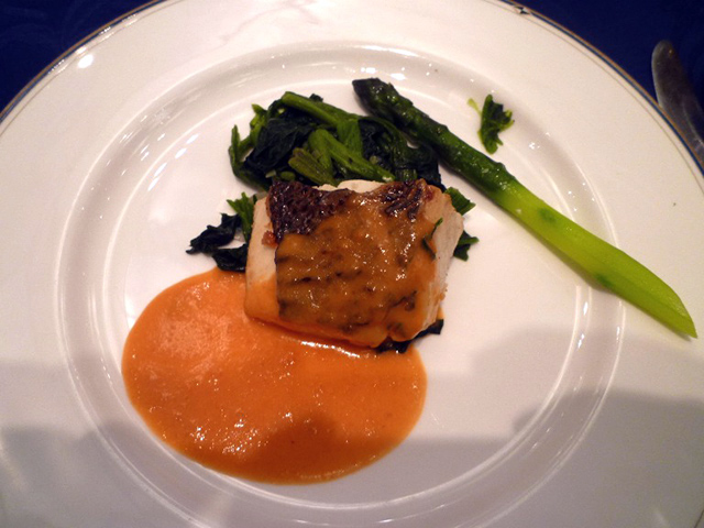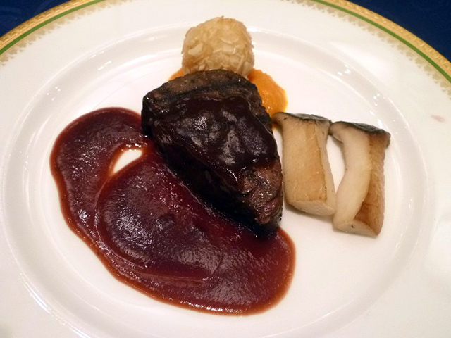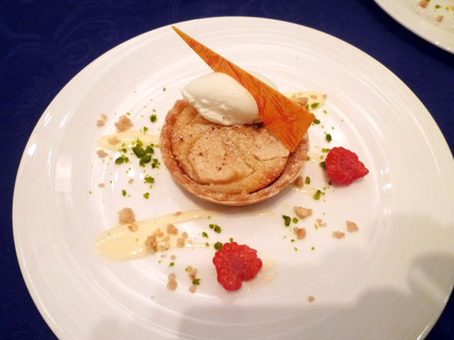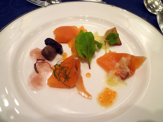 ①スモークサーモントラウト 茗荷とレモンのソース ②ポタージュスープ ③フランスパン ④魚のポワレトマトソース アスパラガスと法連草草添え ⑤牛フィレ肉グリル アーモンドコロッケとエリンギ、ニンジンのピュレ添え赤ワインソース ⑥リンゴのタルト