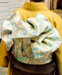 ボリュームたっぷりの牡丹の花姿と、いつか見た長谷寺の牡丹、長い参道の階段を登りながら見上げた色とりどりの奇麗な美しさ、そのイメージを帯で表現してみました。
