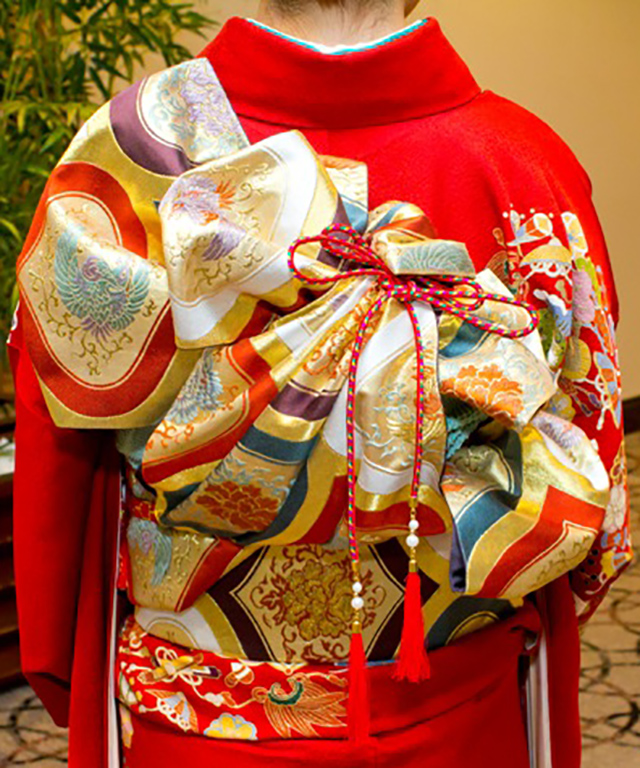 モデルの方は背が高く現代的な方なので、それに負けぬように華やかで存在感のある結び方をしました。