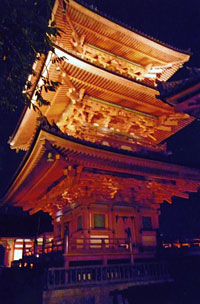そして秋の月夜、足元からライトに照らされて浮かび上がる清水寺の舞台と境内を散策しました。